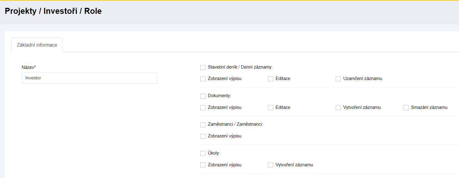Před založením investora je třeba nejdříve vytvořit investorskou roli, kde se vymezí přístupy investora ve stavebním deníku a jeho záznamech.