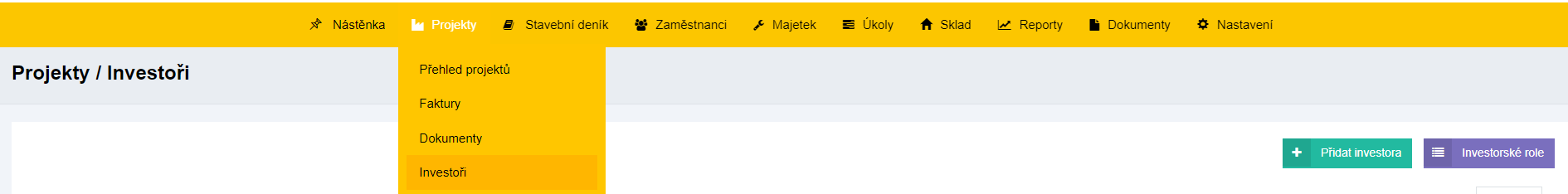 - V agendě “Projekty” vyberte v roletovém menu “Investoři”.