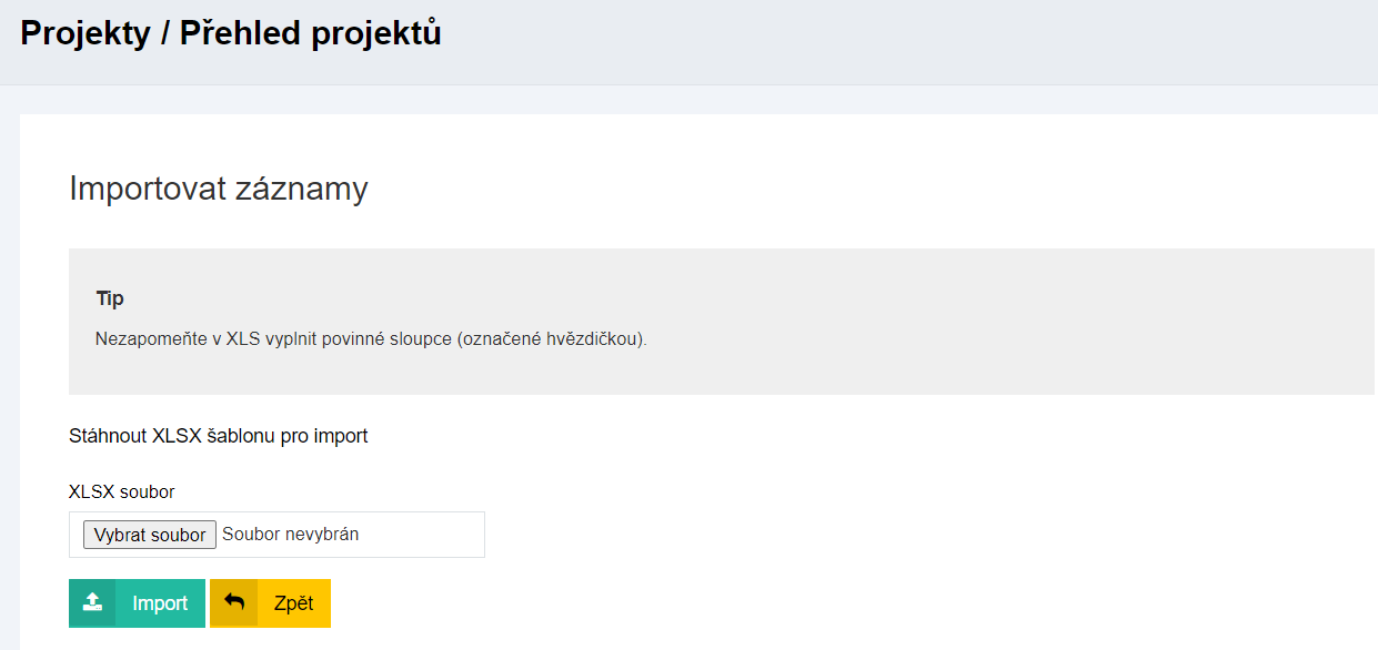 - V otevřené agendě “Přehled projektů” stiskněte tlačítko ”Importovat záznamy”.