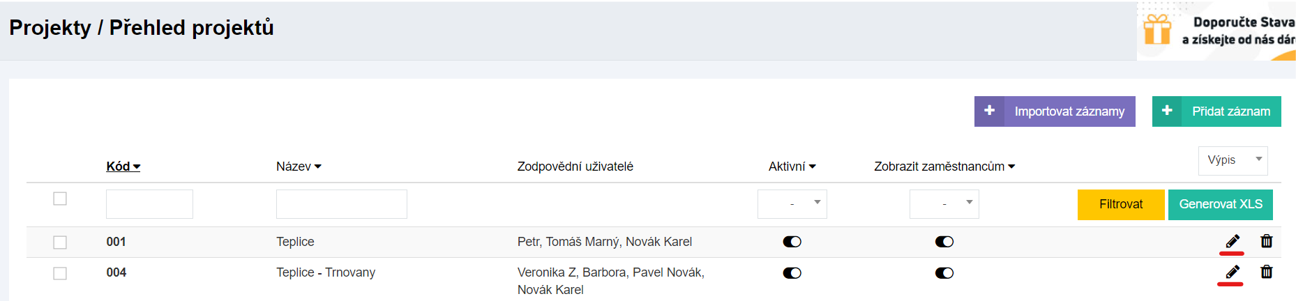 Import záznam Projektů hromadně