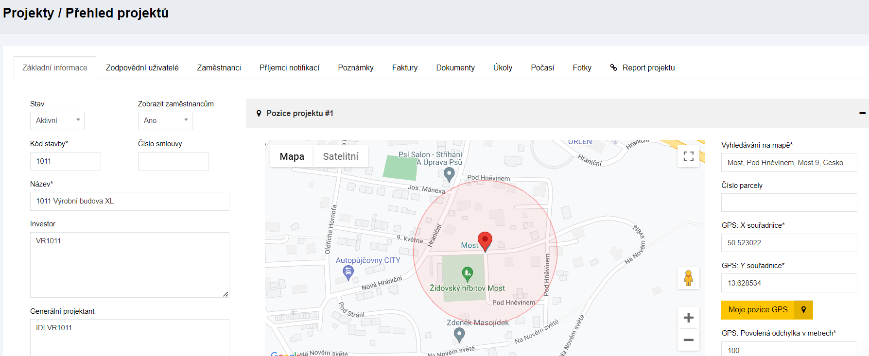 Evidence základních údajů o projektu, GPS souřadnice pro potřeby zaměření docházky a zachycení následných statistik k projektu.
