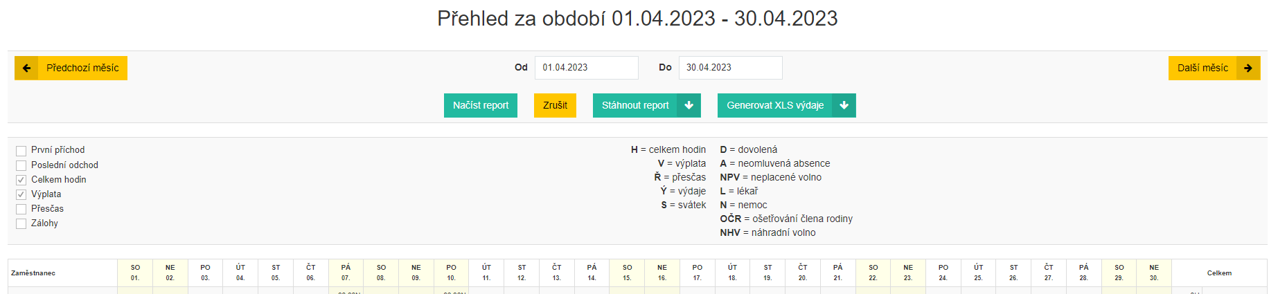 - Pro export dat ve formátu XLS jsou dostupné sestavy “Stáhnout report” s kompletními údaji a “Generovat XLS výdaje” s informacemi o výdajích za zaměstnance.