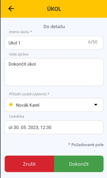 - “Přiřadit osobě (vyberte)” - přiřadí správu úkolu uživateli, toto pole je povinné