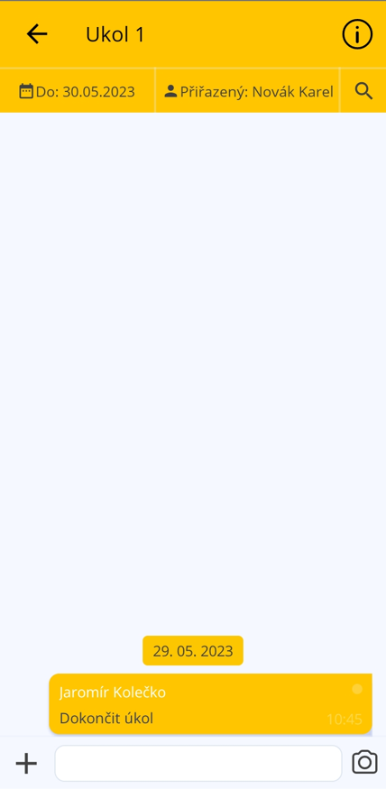 - Aplikace vás přesune do detailu úkolu, kde můžete s ostatními komunikovat a posílat fotky.