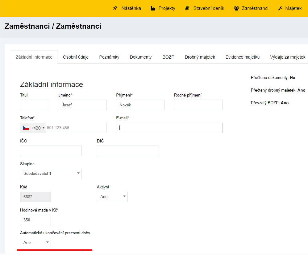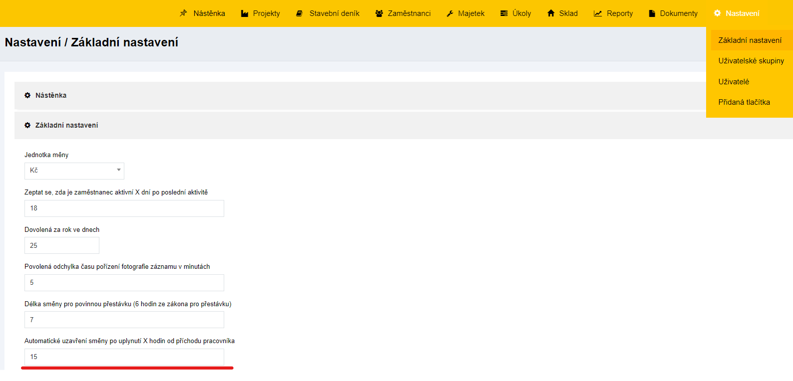 Pokud chcete automaticky ukončovat pracovní dobu po určeném počtu hodin, běžte do sekce"Nastavení / Základní nastavení"a v podnabídce"Základní nastavení"můžete upravit "Automatické ukončení pracovní doby v hodinách".